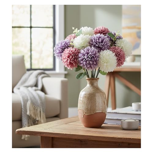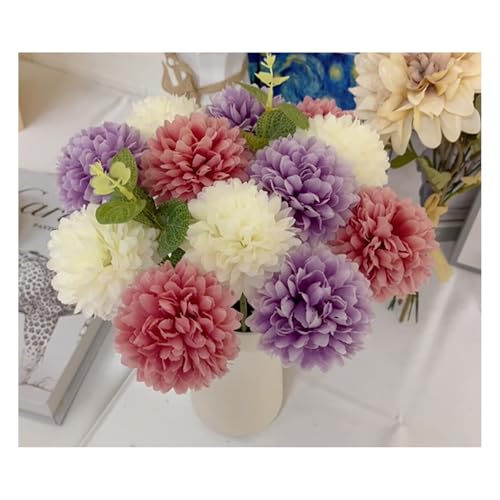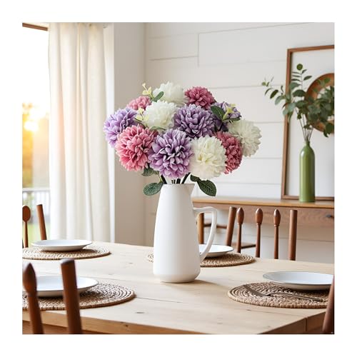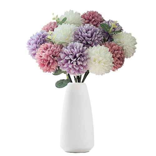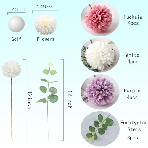 Multicolored Set: You will get 12 multicolor artificial chrysanthemum ball flowers and 3 eucalyptus stems, includes purple, white, fuchsia, 4pcs each color. Each flower head measures 2.8 inches in diameter and 12 inches in height, perfect for DIY floral arrangements and home decoration.