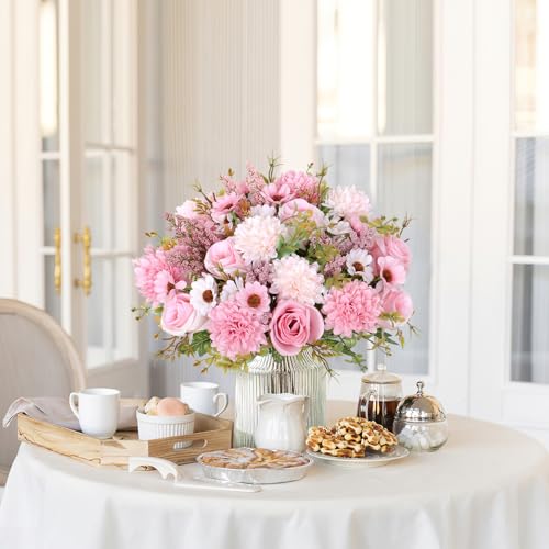 Dremisland Artificial Flowers Like Real Artificial Bouquet 2 Packs Silk Artificial Roses Bouquet with Daisy Chrysanthemum Pink Flowers for Valentines Day Centerpiece Table Wedding Party Decor