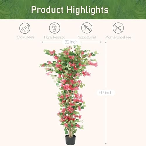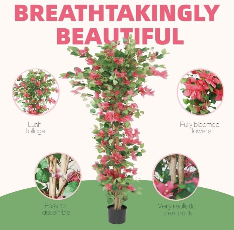 Natural Look & Feel: The artificial bougainvillea tree combines soft silk leaves, vibrant blossoms, and a realistic vine-wrapped trunk for a nearly natural effect. Ideal Dimensions: At 5.58 feet tall, it makes a striking statement while remaining versatile for various spaces. No Maintenance Needed: Skip the watering and trimming—this faux flowering tree stays fresh and vibrant with no effort. Decorative Anywhere: Perfect for home interiors, garden accents, balconies, offices, or porches, bringing instant life to any setting. Shape to Perfection: On arrival, simply adjust the branches and leaves by hand to achieve the desired fullness.