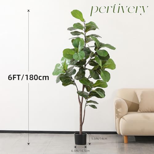 Pertivery 72-inch faux fiddle leaf fig tree contains multiple real-life big fiddle leaf pieces. The leaves are made of rubber silk fabric, and there are veins on each leaf. Coupled with a highly realistic trunk and multiple irregular branches, the whole tree looks very realistic.