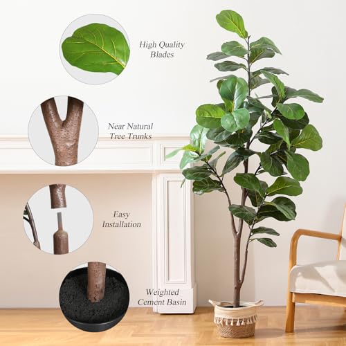Artificial Fiddle Leaf Fig Tree 6ft, Large Faux Plant Fake Ficus lyrata Silk Trees with Pot for Indoor Outdoor House Living Room Office Home Decor