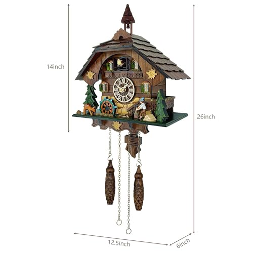 Cuckoo Clock Wall Art, Animated Scene, 12 Melodies, Volume Control, Night Mode, Germany Style Black Forest Retro Handcrafted Wooden Chalet, Traditional Rustic Home Decor, Gift for Family (12.5″x26″)
