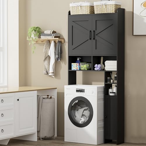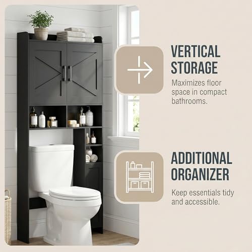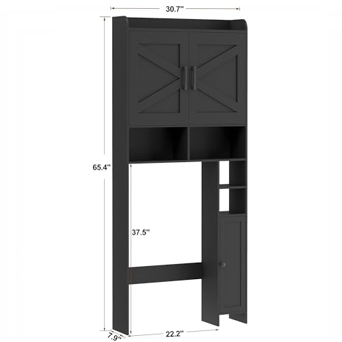 Homhedy Over The Toilet Storage Cabinet with 2 Barn Door and Toilet Paper Holder Stand, FreeStanding Toilet Shelf Space Saver, for Bathroom, Restroom, Laundry, Black