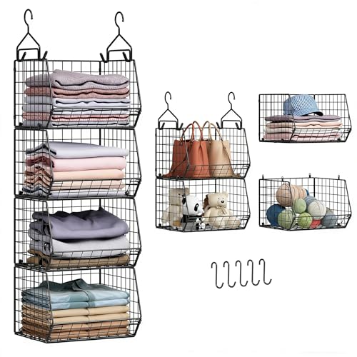 4 Tier Closet Hanging Organizer, Closet Organizers and Storage with 5 S Hooks, Closet Hanging Shelves & Freestanding Wire Storage Basket Bins, for Clothing Shoes Handbags Clutches Accessories Patent