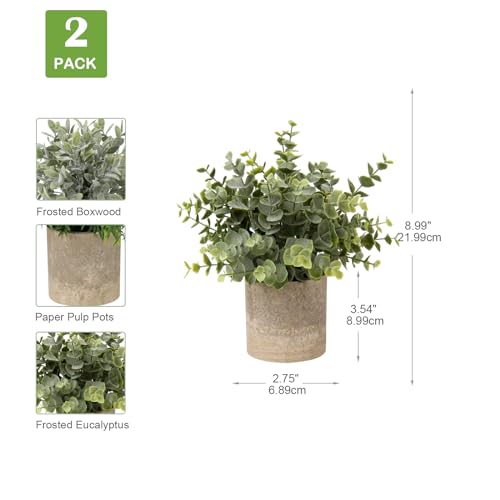 Package and Dimensions: Comes with 2 types of potted plants(eucalyptus, boxwood), each paper pulp plant pot is 2.75″ in diameter and 3.54″ in height. While the artificial plant measures approximately 8.66″ tall from the bottom to the top of the plant. The white flocking on the leaves is to imitate the frosty gray-green leaves of plants and flock to the surface of each potted plant.