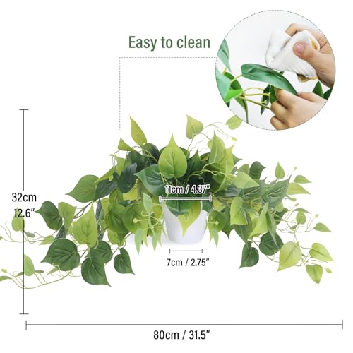 Faux Plants Indoor – The fake plants leaf is made of high-quality PE, green leaf comes with black pot, durable and not fragile, easy to maintain. The faux pothos won’t deteriorate under harsh weather and the fake hanging plants’ stem and leaves are super sturdy. Ideal for adding a dash of refreshingly modern design to your home. Eco-friendly artificial plant is perfect addition to your home or office decor