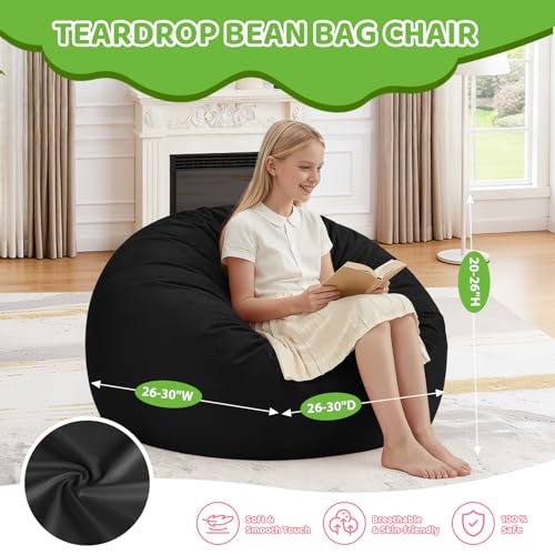 2FT Bean Bag Chair, Comfy Bean Bag Chairs with Memory Foam Filled, Fluffy Beanbag Sofa with Dutch Velvet Cover, Teardrop BeanBag Chairs for Living Room, Playroom – Black