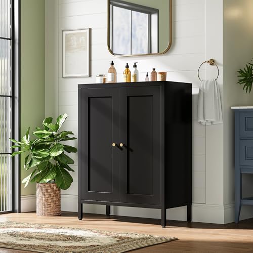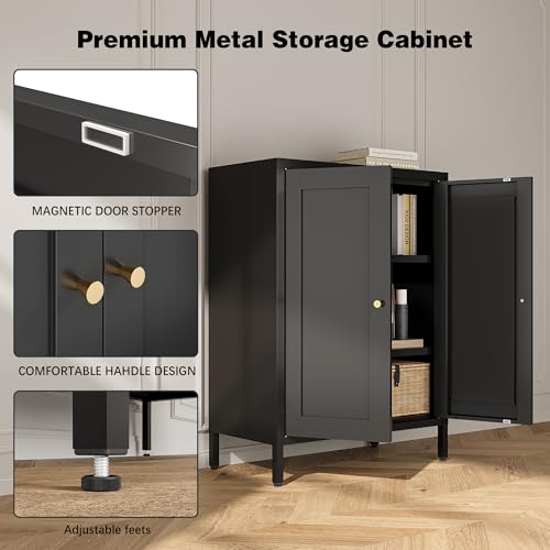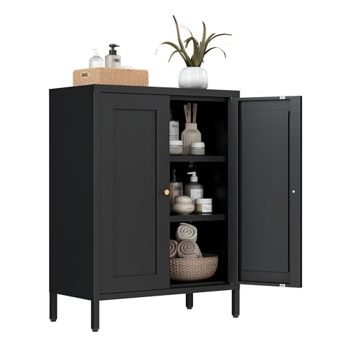 Small Bathroom Storage Cabinet, Black Metal Locker Cabinet with 2 Doors and 2 Adjustable Shelves, Metal Floor Cabinets Sideboard for Home Office, Living Room, Hallway, Entryway