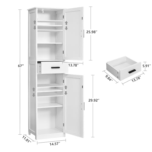 usikey 67” Tall Bathroom Cabinet, Storage Cabinet with 4 Shelves & 2 Doors, Narrow Storage Cabinets for Bathroom, Living Room, Home Office, White