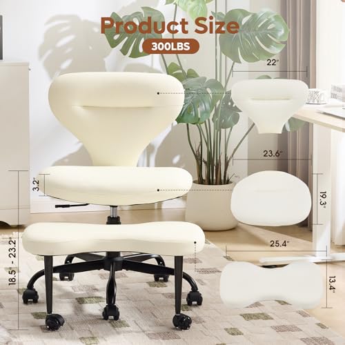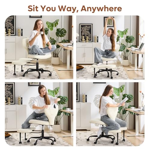YFO Ergonomic Cross Legged Office Chair and ADHD Meditation Chair with Silent Wheels for Home Office Desk Chair and Yoga, Wider Backrest Support and Storage Pockets Design, PU Leather, Cream