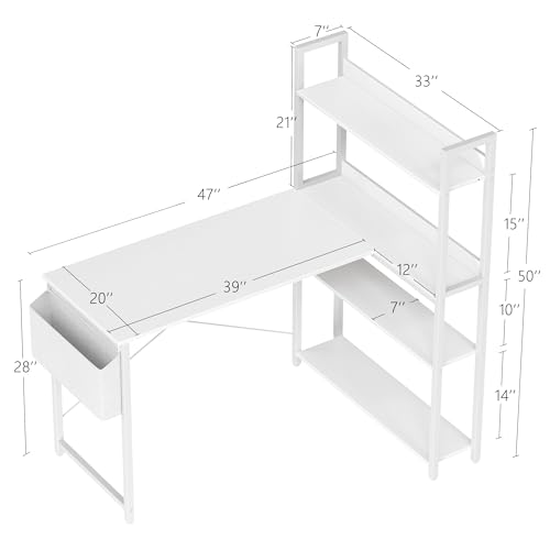 Treesland 47 Inch Computer Desk with Bookshelf, Corner Desk with Storage, L Shaped Desk, Home Office Desks, Writing Study Desk for Bedroom, White