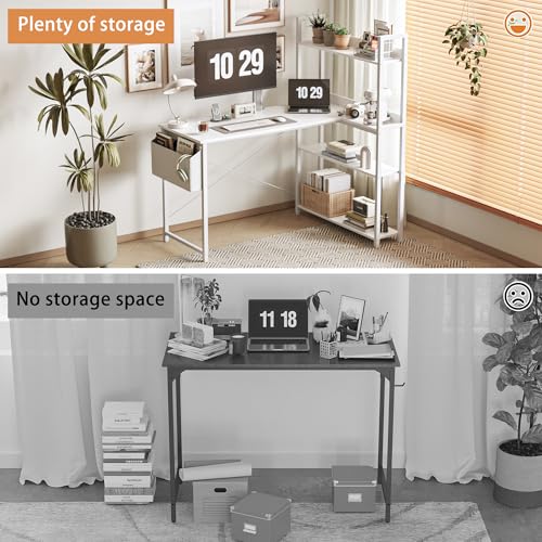 Ample Storage Options: The desk is equipped with a 4-tier shelf and a side storage bag, offering multiple storage options to keep your essentials organized and within reach. The shelves can accommodate books, documents, office supplies, or decorative items, while the side storage bag is perfect for holding magazines, notebooks, or small electronics.