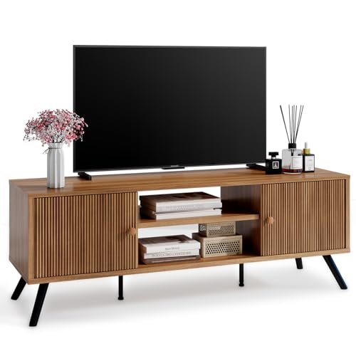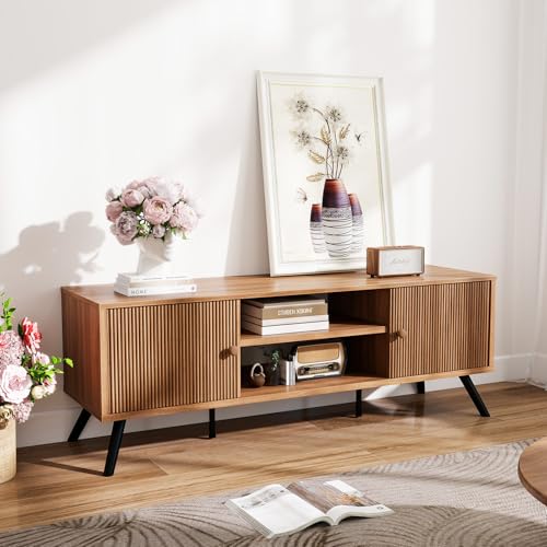COMHOMA TV Stand for Living Room, Mid Century Modern Entertainment Center for 55/60/65 Inch TVs, Retro Brown TV Console with Fluted Door Cabinets and Open Adjustable Shelve Storage for Bedroom