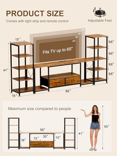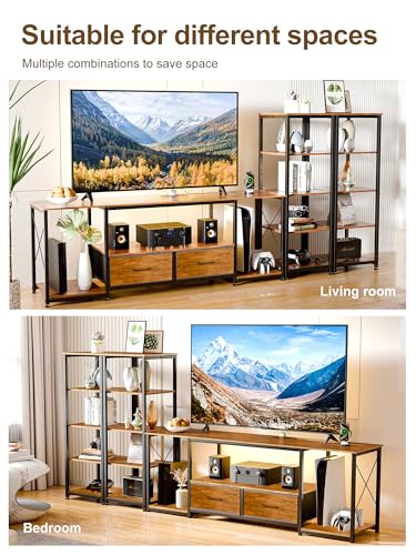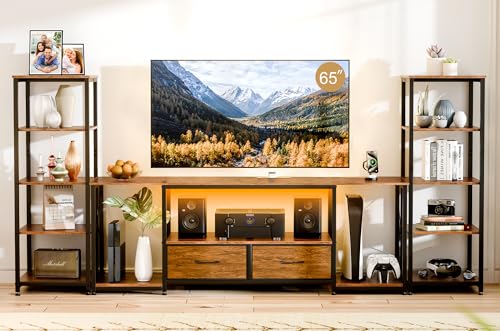TV Stand for TVs up to 65 Inch Entertainment Center with 2 Bookshelves Rustic Farmhouse Modern TV Console with 2 Fabric Drawers, LED Lights & Power Outlets for Living Room