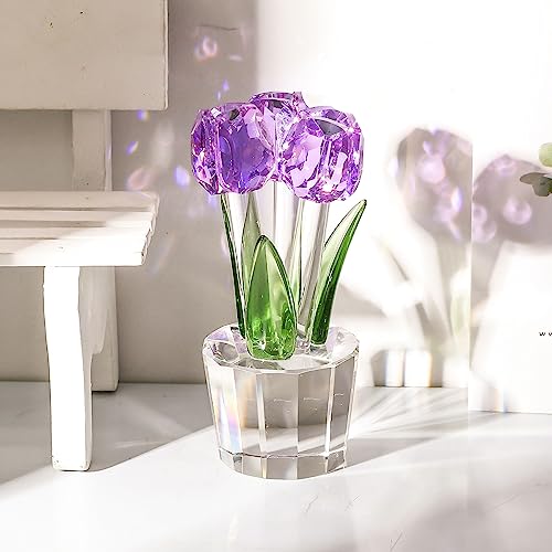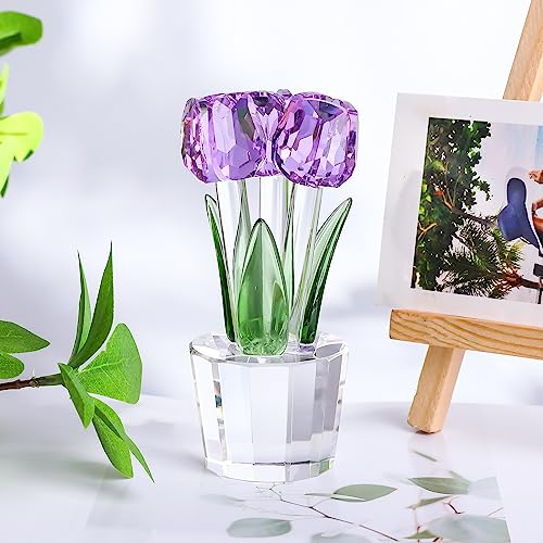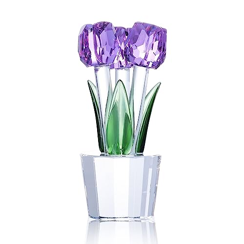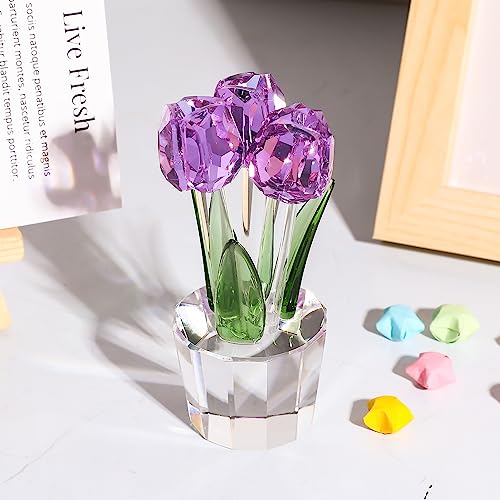 Movdyka Tulips Glass Flowers Figurines Crystal Decor Collectibles Crystal Purple Flowers Bouquet Ornaments Mothers Day Tulip Gifts for Women on Anniversary Wedding Christmas Valentines