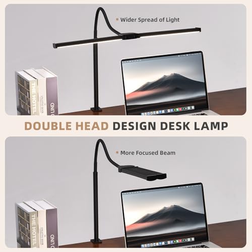 LED Desk Lamp for Home Office, Double Head Architect Light with Clamp, Computer Monitor Clip on Light, 3 Modes and 10 Brightness, Adjustable Flexible Goose-Neck, Table Task Lamp, Black