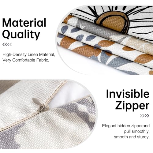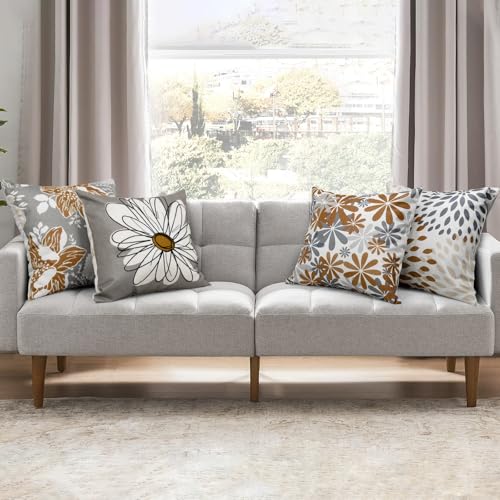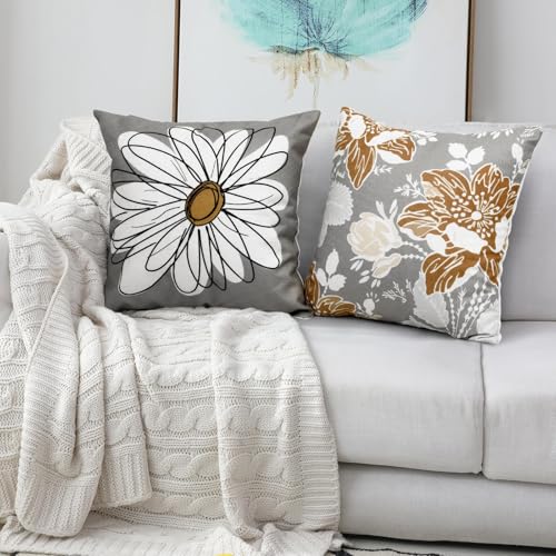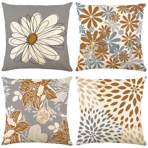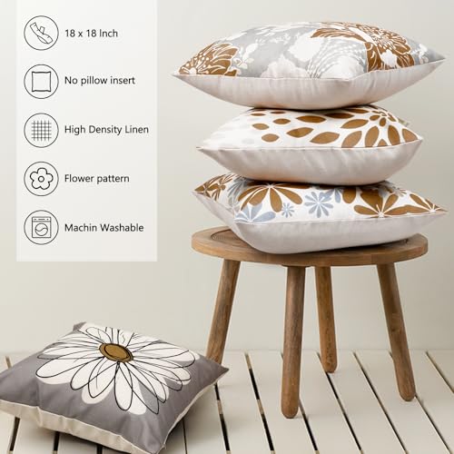 Baidast Brown Decorative Throw Pillow Covers 18×18 Set of 4, Brown and Grey Modern Daisy Floral Pillows Linen Pillow Covers for Couch Sofa Living Room