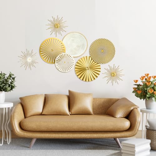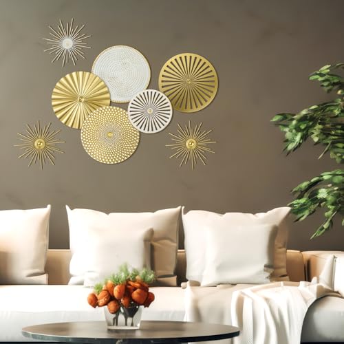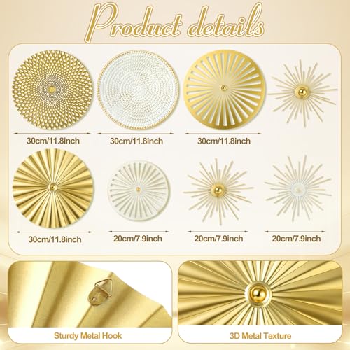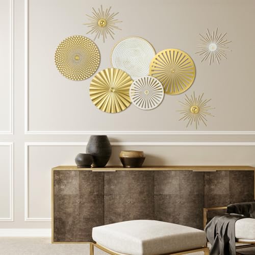 Lingvee 8 Pcs Gold Wall Decor Modern Metal Decor Metal Starbursts Radial Plate Art Hanging Decorative Wall Decorations for Home Bedroom Bathroom Living Room Office Sculpture (Gold, White)